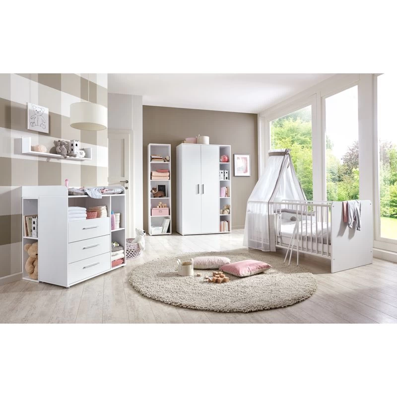 - Contenu de la livraison : Lit bébé, commode à langer avec étagère murale, étagère arrière, armoire