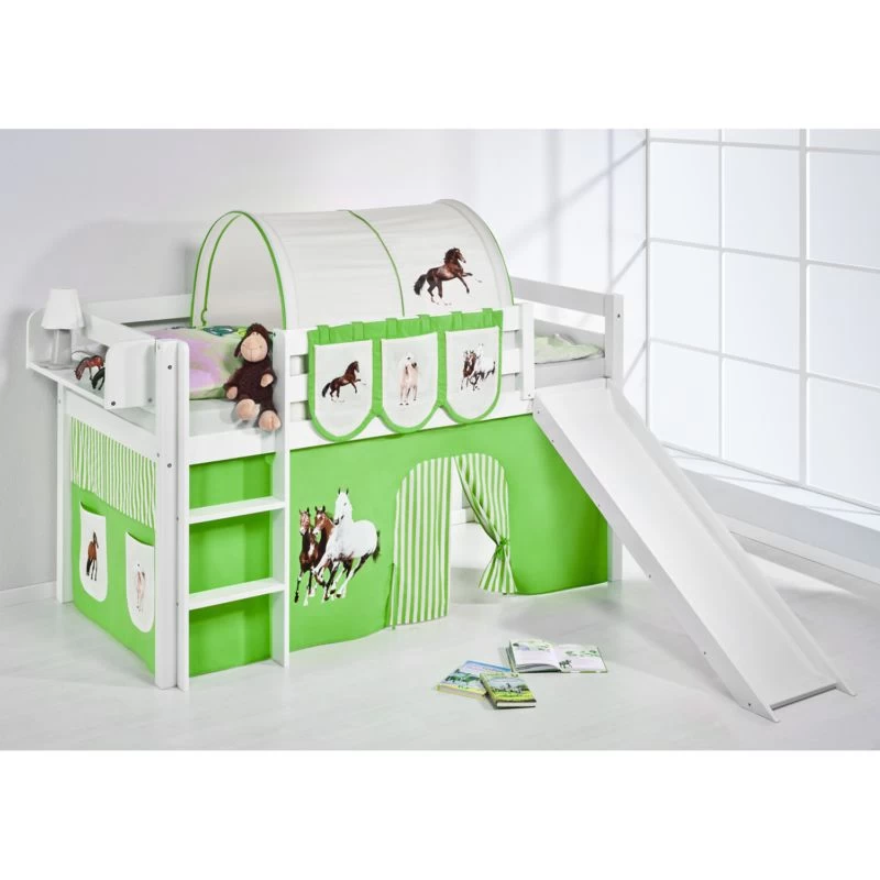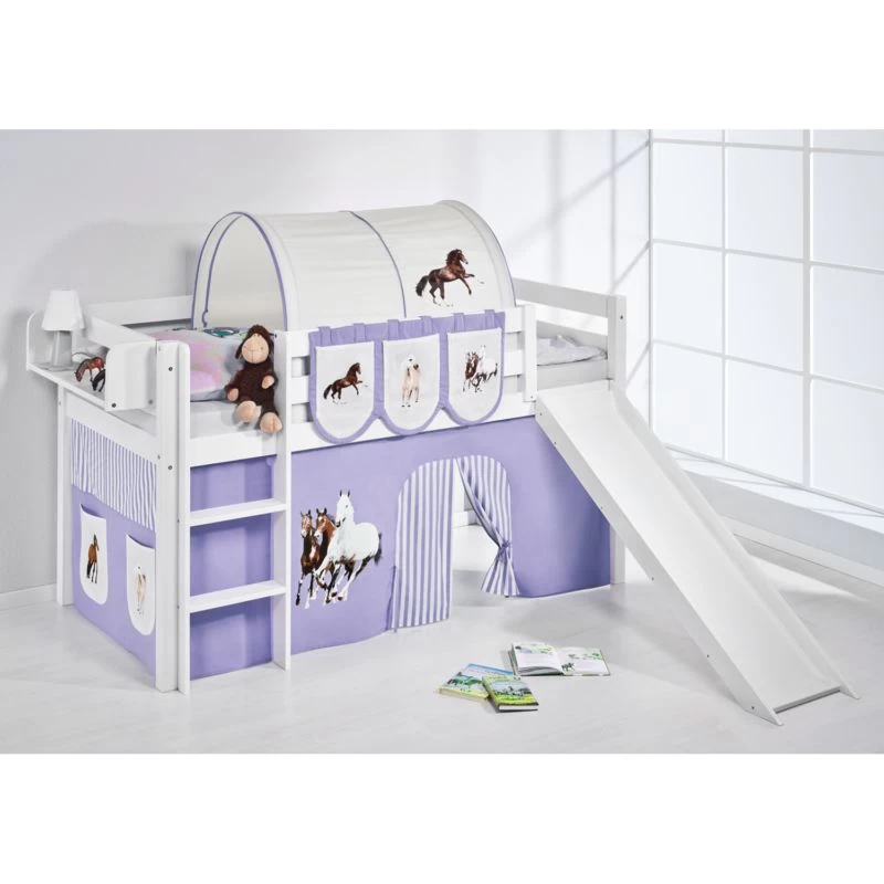 - Contenu de la livraison : Lit mezzanine JELLE avec toboggan, incluant 2 rideaux et une tour