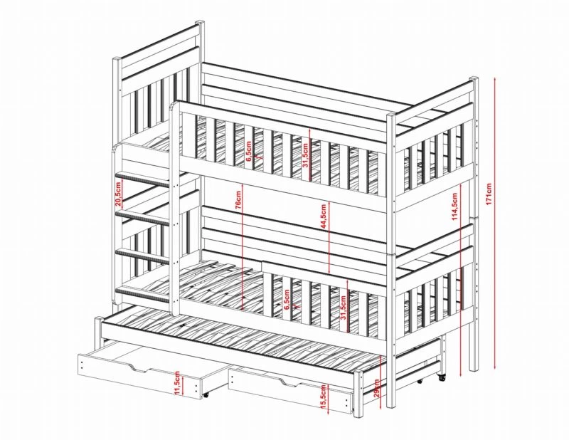 - Contenu de la livraison : Lit superposé x 1 / tiroirs : Inclus x 2 / Armoires : Inclus / Matelas : Non inclus dans le set