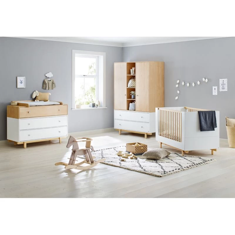 3 pièces : lit de bébé évolutif, commode à langer large et armoire grande