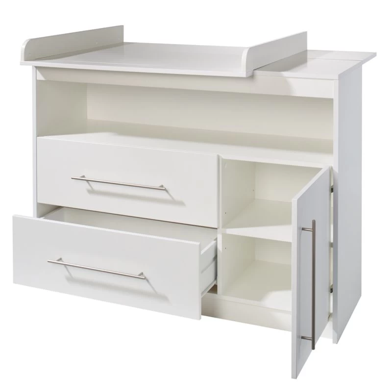 - Cadre : panneau aggloméré mélaminé, barrières : contreplaqué, corps : panneau aggloméré mélaminé, façade : panneau aggloméré mélaminé, panneau arrière : HDF, étagères : panneau aggloméré mélaminé, poignées : métal, plateau à langer : panneau aggloméré mélaminé