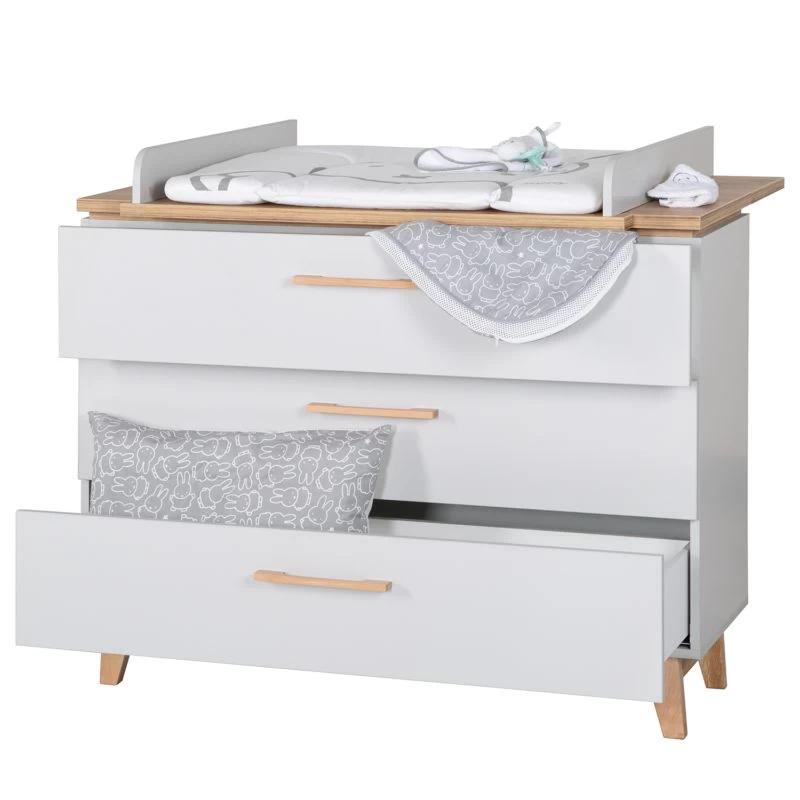 - Barreaux : hêtre massif, commode à langer Corps : panneau aggloméré mélaminé